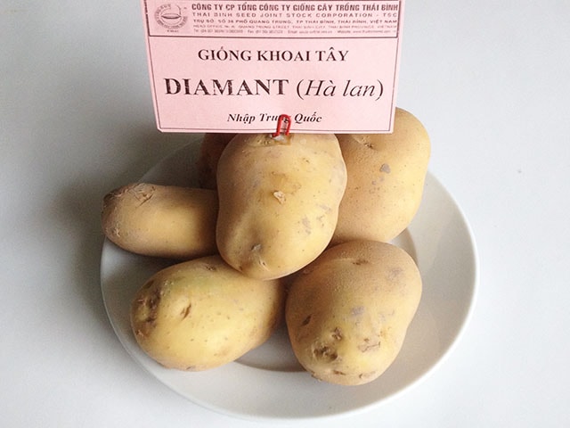 - Dạng củ hình oval – tròn, mắt nông, vỏ củ màu vàng sáng, bóng đẹp, ruột củ vàng, năng suất cao đạt 800 – 900kg/sào. Chất lượng củ tốt, hàm lượng tinh bột cao.